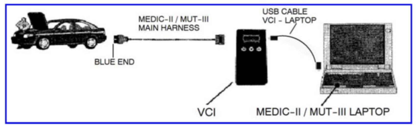 ^ Connect the MUT-III main harness with the blue DLC connection to the VCI.