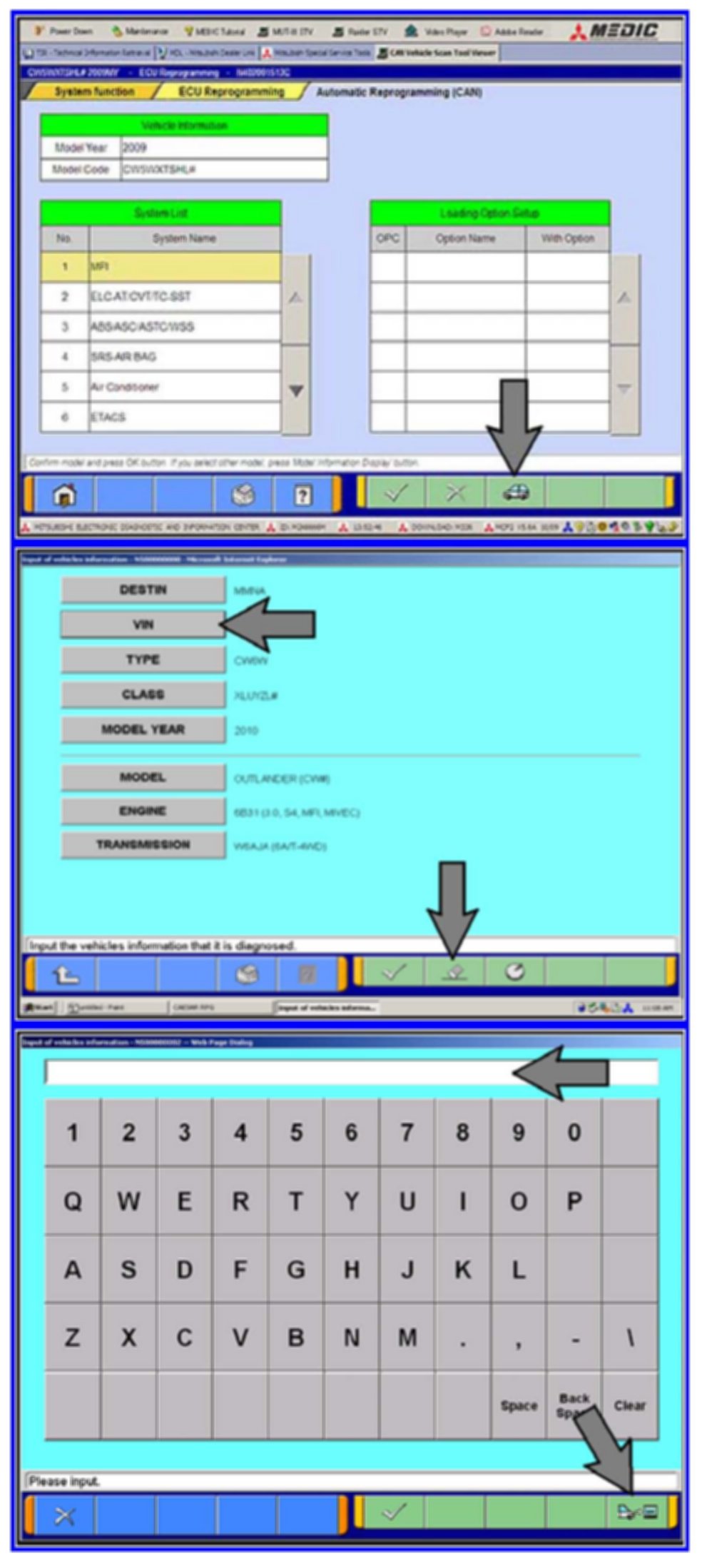 h. Click on the icon in the lower RH corner of the screen to have MUT-III automatically read the VIN. If a message appears saying that the VIN cannot be input automatically manually type the 17 digit VIN into the VIN field at the top of the page.