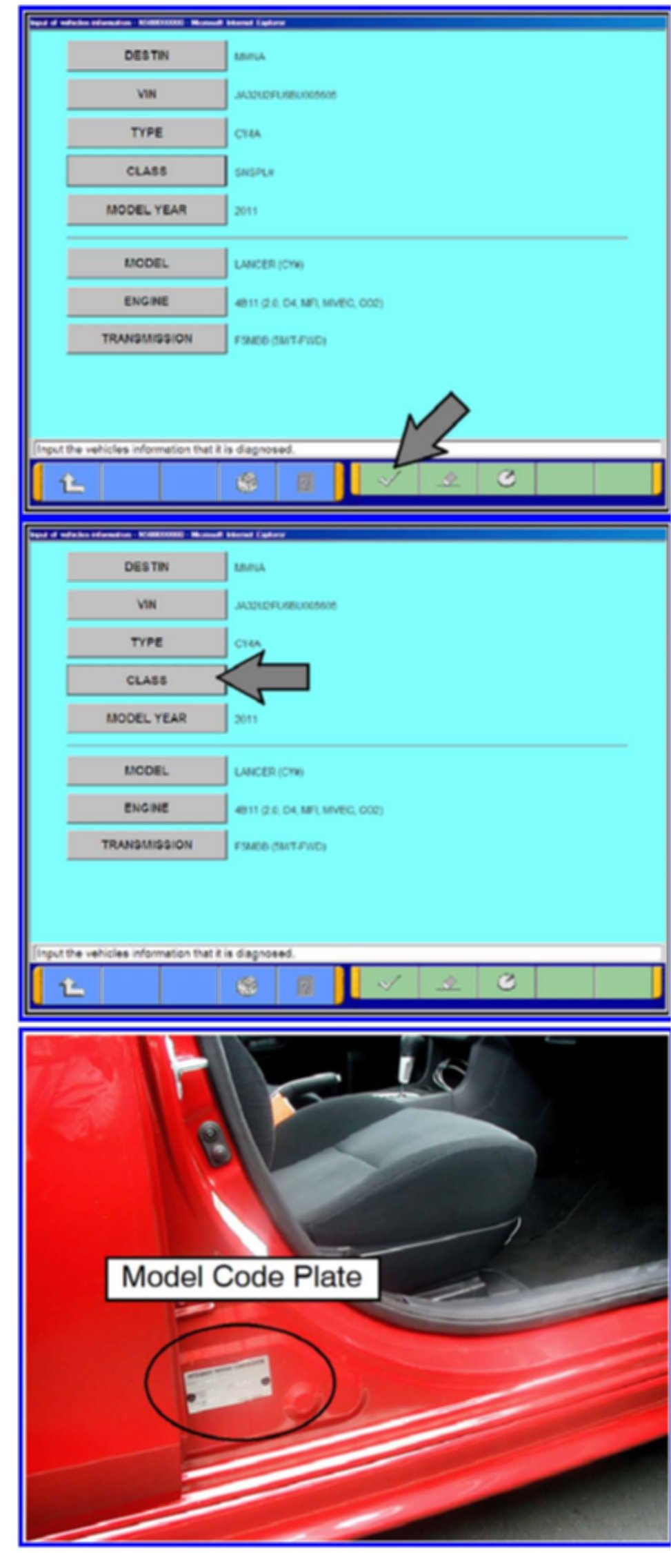 Vehicle class can be found on the Vehicle Information Code Plate riveted to the base of the RH b-pillar (see photo). Vehicle class is part of the model code. Click the check mark to enter the class.