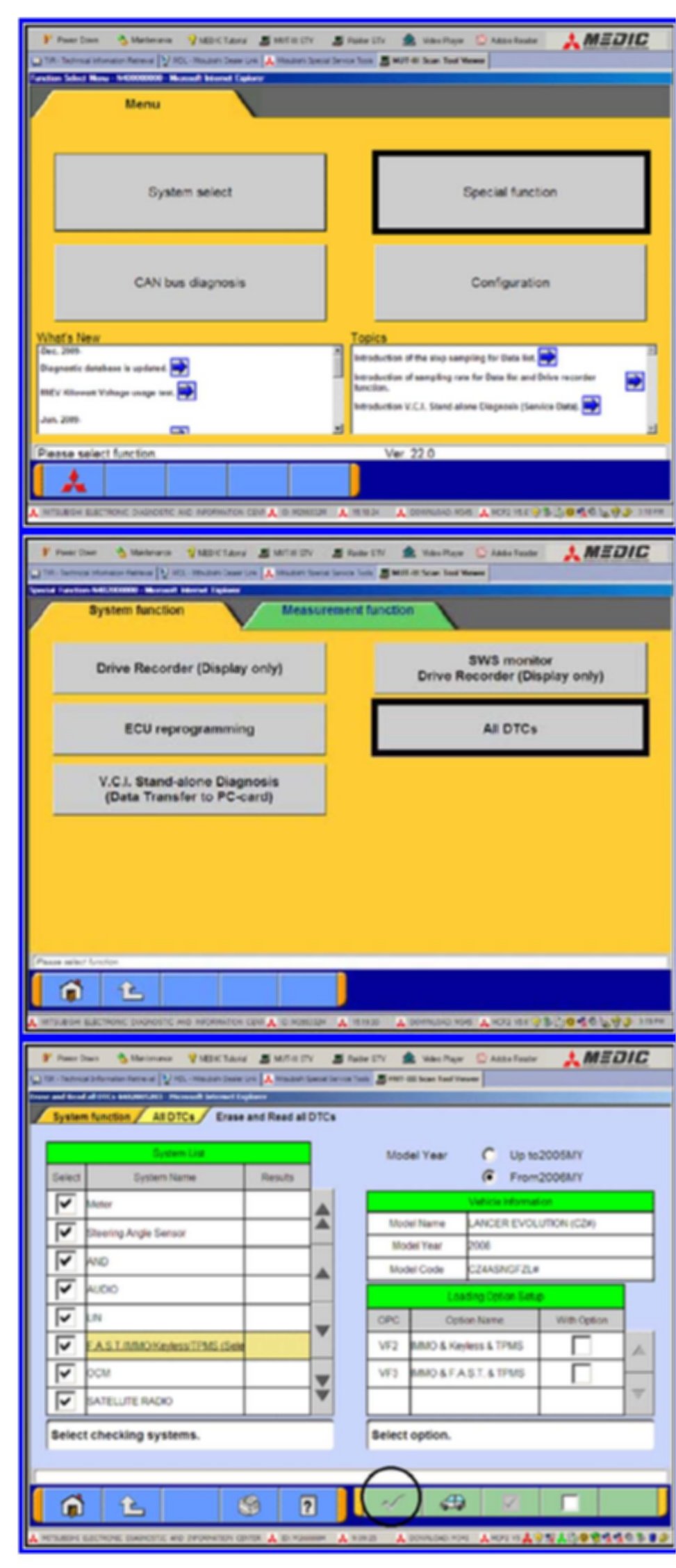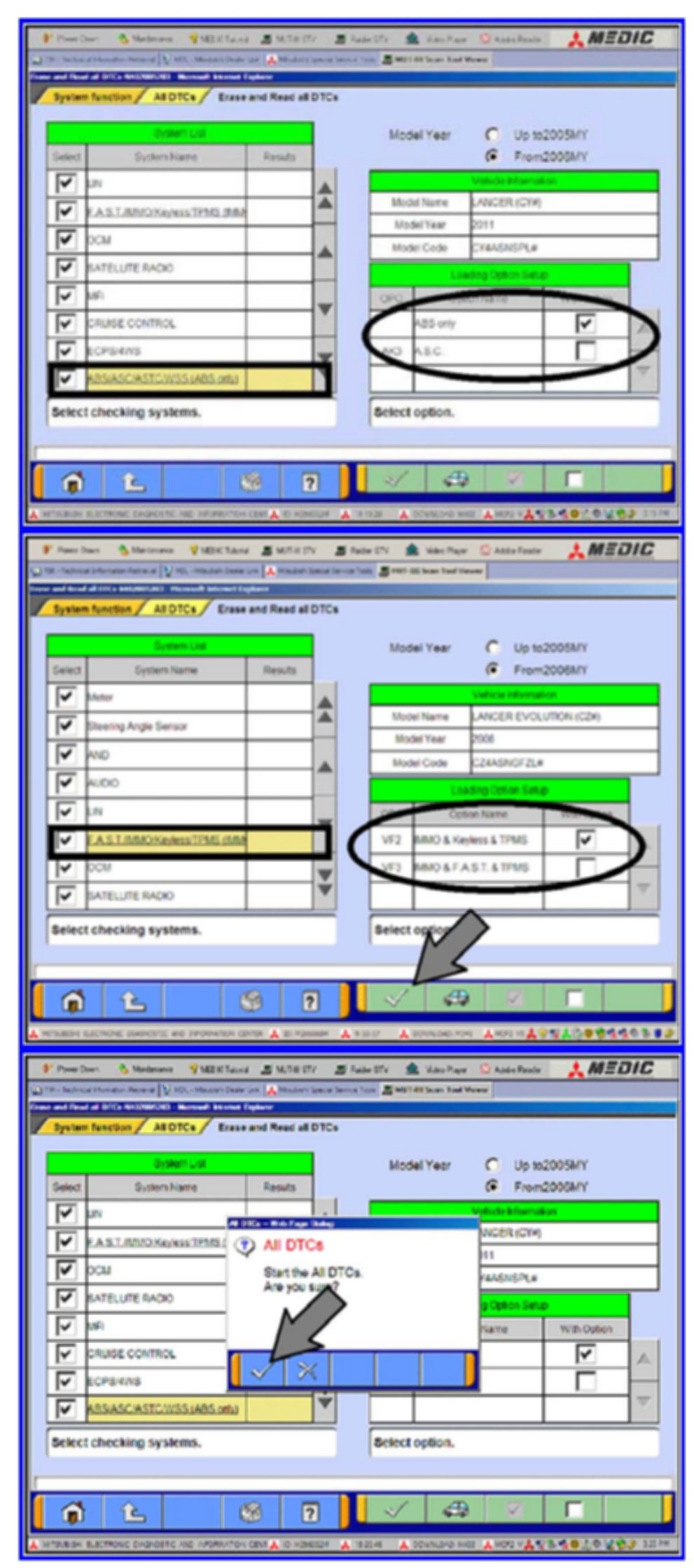 3. Using the MUT-III, check and erase ALL DTCs from all systems as follows.
