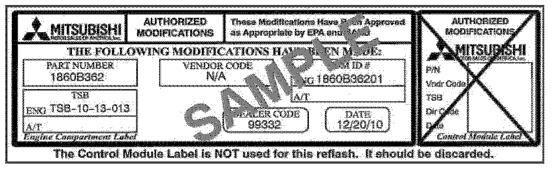 6. Using a ball-point pen enter the appropriate Engine Control Module (ECM) part number Software Part Number (ROM ID#) this Technical Service Bulletin number (TSB-10-13-013), your dealer code and the current date on the Engine Compartment / Control Module Label (p/n MSSF024G00). The Vendor Code is not applicable. The label is available from your facing PDC.