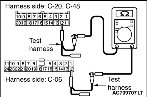 STEP 29. Check the wiring harness between joint connector (CAN1) C-06 and A/C-ECU connector C-20 [vehicles with A/C] or heater control unit connector C-48 [vehicles without A/C] for line-to-line short. Measure the resistance at joint connector (CAN1) C-06.
