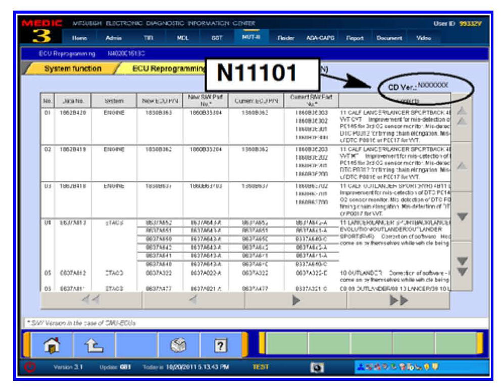 2. If the database number displayed on your MUT-III is lower than N11101, locate the Yellow MUT-III Reflash CD 02/11 and follow the instructions on the CD label to update your MUT-III.