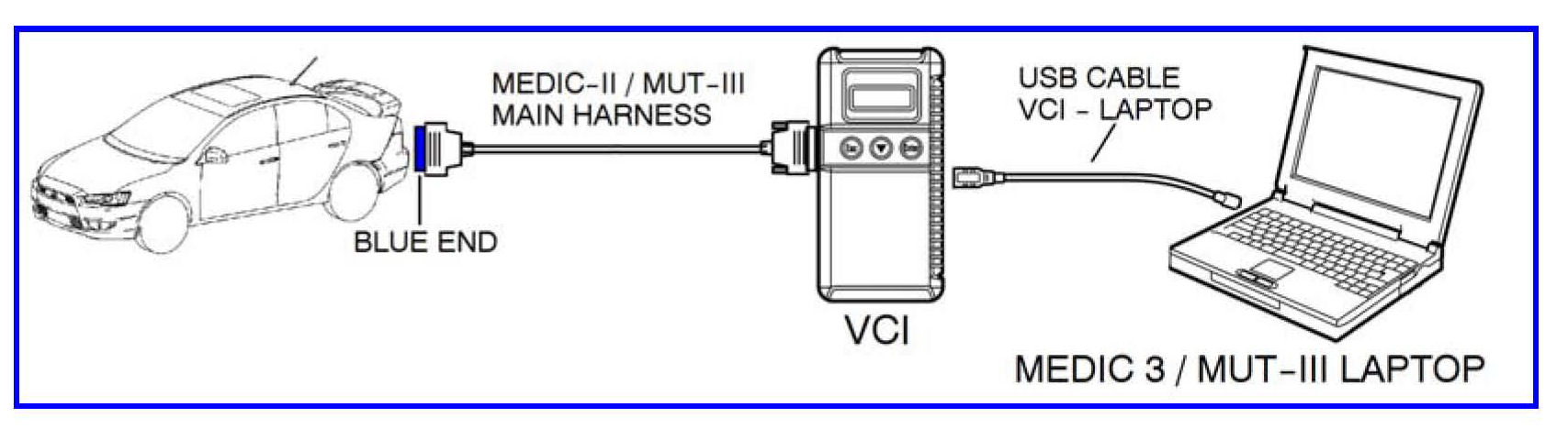 ^ Connect the MUT-III main harness with the blue DLC connection to the VCI.