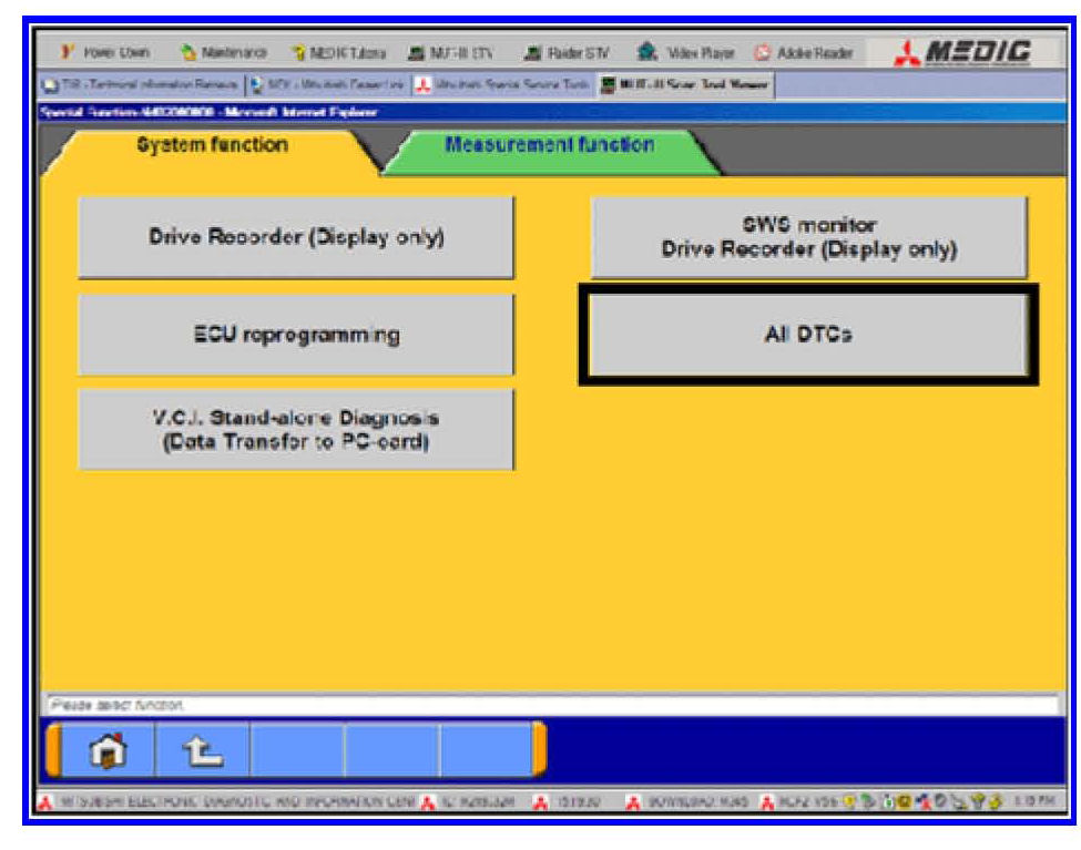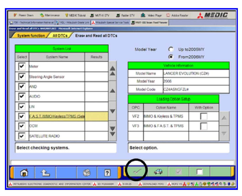 3. Using the MUT-III, check and erase ALL DTCs from all systems as follows.