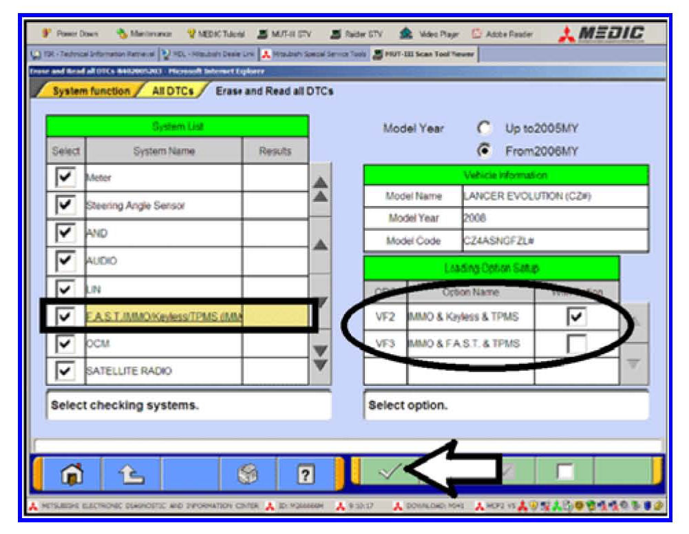 e. In the left column scroll to and click FAST/IMMOB/KEYLESS/TPMS. In the right column check the correct option code (VF#) from the Loading Options Setup list. This will activate the check mark at the bottom of the page.