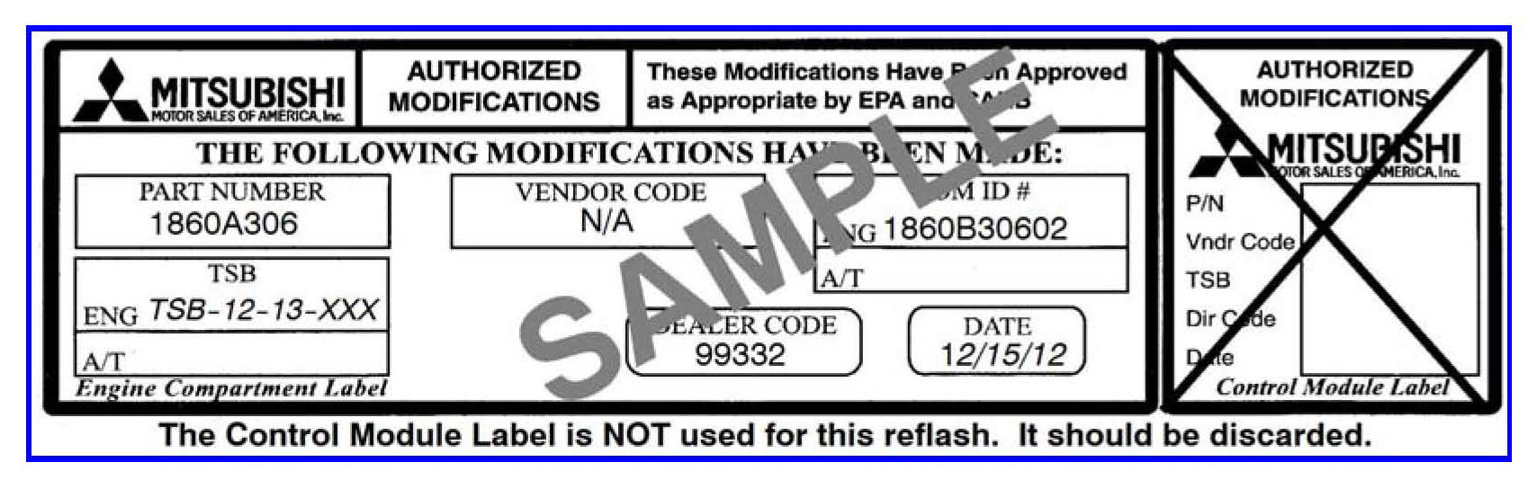*7. Using a ball-point pen enter the appropriate Engine Control Module (ECM) part number Software Part Number (ROM ID #) this Technical Service Bulletin number (TSB-12-13-XXX), your dealer code and the current date on the Engine Compartment / Control Module Label (p/n MSSF024G00). The Vendor Code is not applicable. The label is available from your facing PDC.*