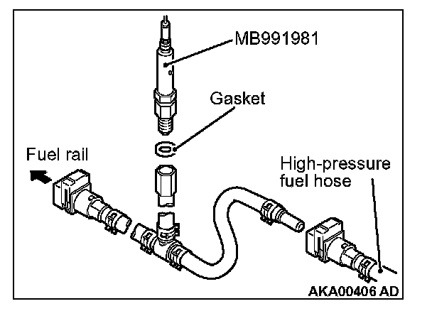 a. Via a gasket, install the special tool MB991981 (fuel pressure gauge set) into the special tool that has already assembled as described.