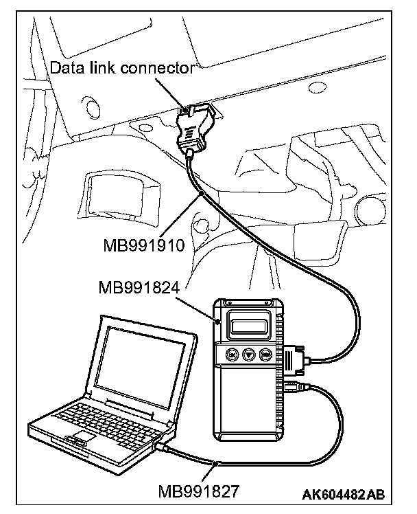 CAUTION: To prevent damage to scan tool MB991958, always turn the ignition switch to the "LOCK" (OFF) position before connecting or disconnecting scan tool MB991958.