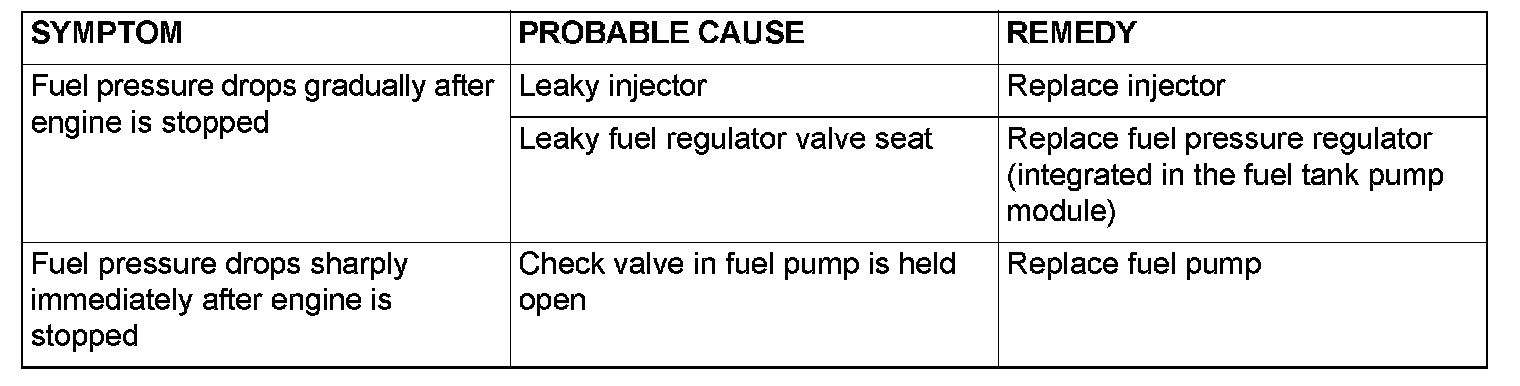13. Stop the engine and observe fuel pressure gauge reading. It is normal if the reading does not drop within two minutes. If it does, observe the rate of drop and troubleshoot and repair according to the table below. Start, then stop the engine.