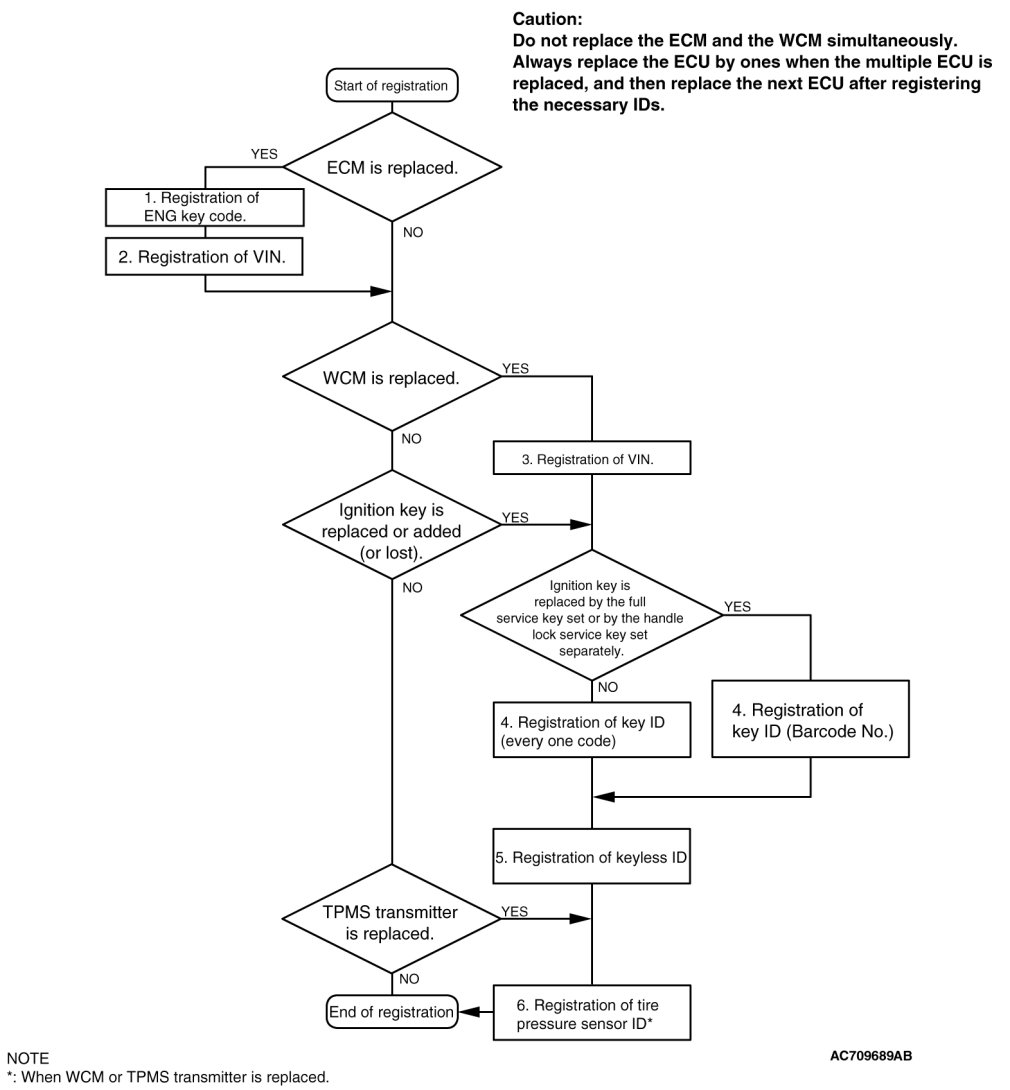 Do not replace the engine control module (ECM) and WCM at the same time. When replacing several ECUs, always replace one ECU at a time, register the necessary IDs in it, and then replace the next ECU.