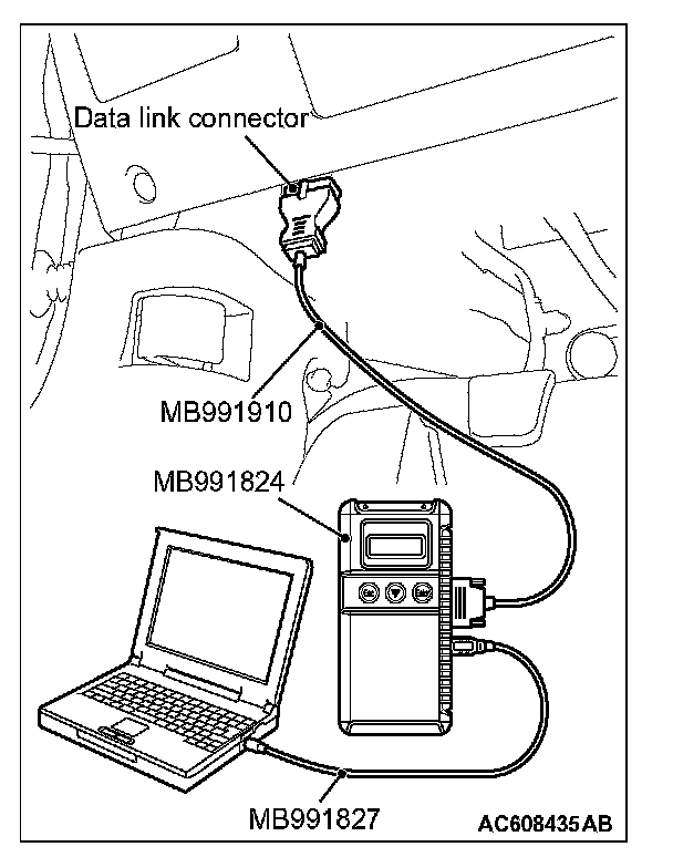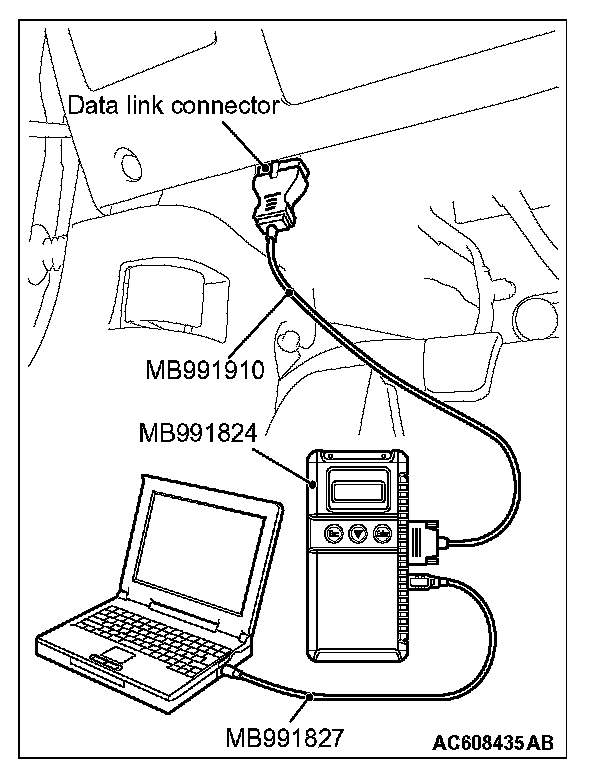 1. After the ignition switch is in "LOCK" (OFF) position, connect scan tool MB991958 to the diagnosis connector.