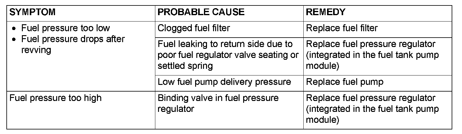 12. If any of fuel pressure measured in Step 10 to 11 is out of specification, troubleshoot and repair according to the table below.