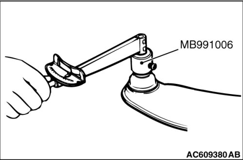 1. Move the lower arm ball joint stud back and forth for several times, and measure the lower arm ball joint rotation starting torque using special tool MB991006.