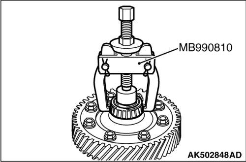 Using the special tool MB990810, remove the inner race of differential side bearing (transaxle case side) from the differential sub-assembly.