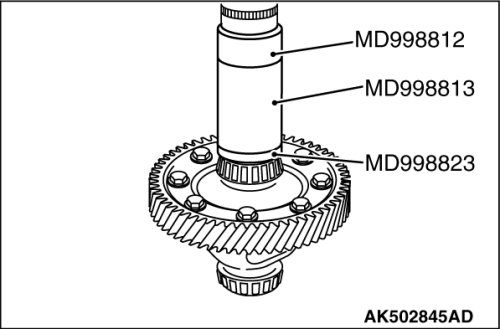 Using the special tools MD998812, MD998813 and MD998823, install the inner race of reduction gear bearing (transaxle case side) on the reduction gear sub-assembly.