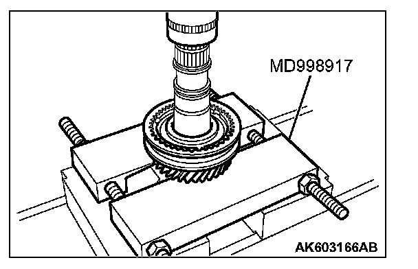 Using special tool MD998917, support the 3rd gear sub-assembly and remove the 3rd gear sub-assembly, synchronizer sleeve No.2 and synchronizer hub No.2.