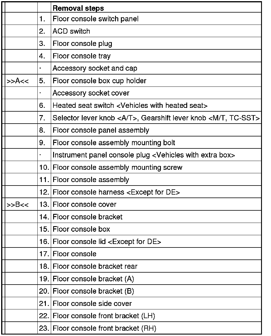 Floor console rear ends (shown in the dotted lines) may damage when removing the floor console cover. You can neglect this damage and floor console rear is reusable.