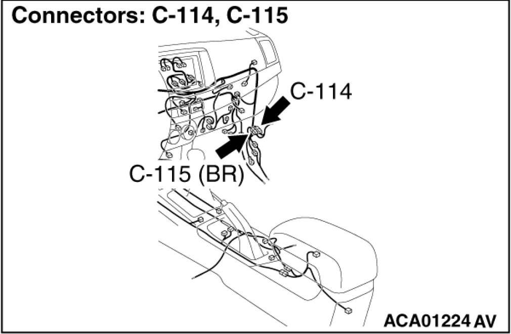 Also check intermediate connectors C-114, C-115 for loose, corroded, or damaged terminals, or terminals pushed back in the connector. If intermediate connectors C-114, C-115 is damaged, repair or replace the damaged component(s) as described in Harness Connector Inspection Harness Connector Inspection.