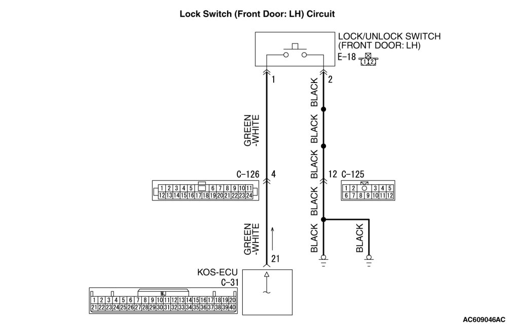STEP 4. Check the wiring harness between KOS-ECU connector C-31 (terminal No. 21) and lock/unlock switch (front door: LH) connector E-18 (terminal No. 1), and between lock/unlock switch (front door: LH) connector E-18 (terminal No. 2) and ground.