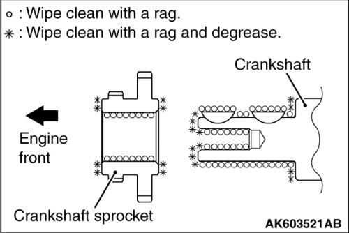 1. Wipe the dirt on the crankshaft sprocket and the crankshaft using a rag, and then remove the grease from the portion shown in the illustration.