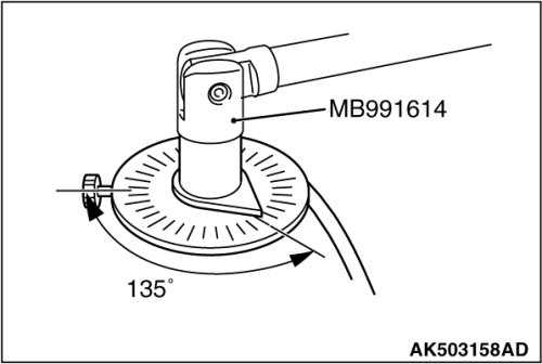 9. After tightening them to the specified tightening torque of 20 Nm again, use special tool MB991614 to tighten them up to 135°.