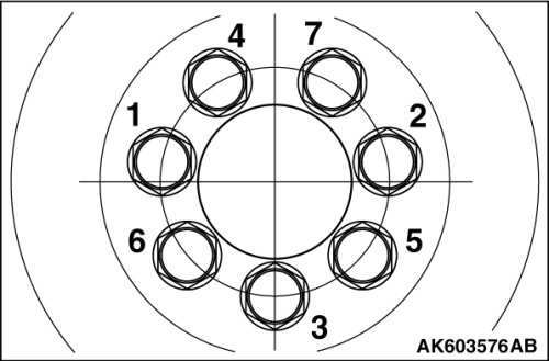 6. Tighten drive plate bolt or flywheel bolt to specified tightening torque of 130 Nm(95 ft-lb) in the order shown in the illustration.