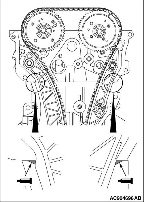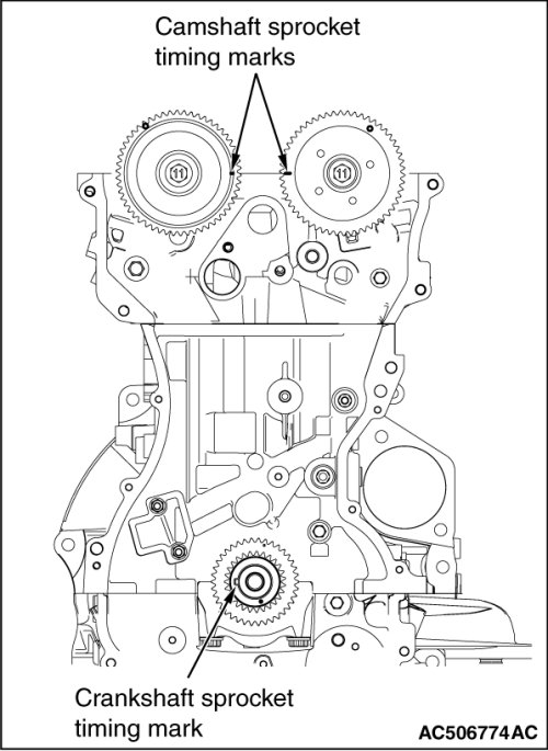 1. Set the timing marks of the camshaft sprockets and the crankshaft sprocket as shown in the figure.