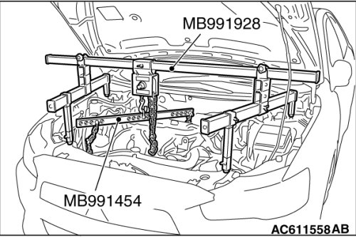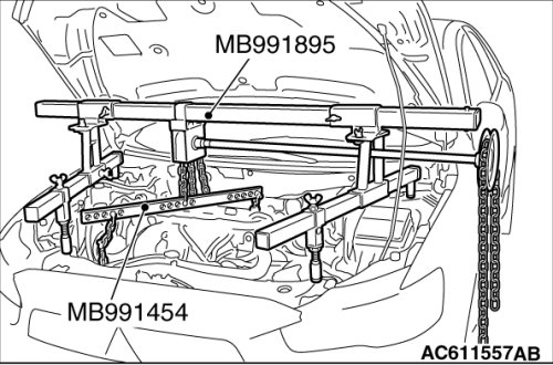 (2) Mount special tool MB991454 to the power steering oil pump bracket and the engine hanger, and set it to special tool MB991895 to support the engine and transaxle assembly.