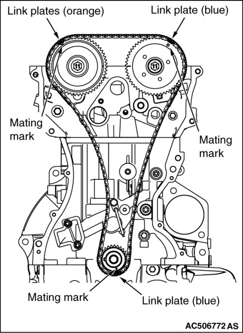 At this time, it is not necessary that the link plate (orange or blue) of the timing chain always aligns with each sprocket timing mark.