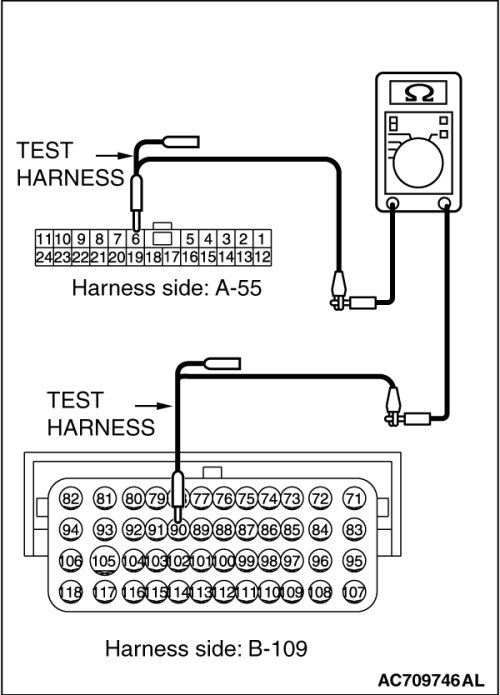 (4)Check the wiring harness between joint connector (CAN4) A-55 (terminal 6) and ECM connector B-109 (terminal 90) [RALLIART]
