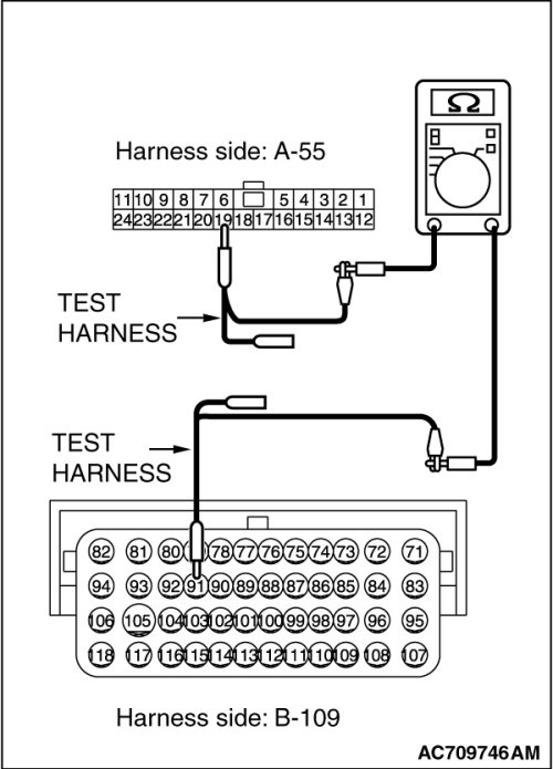 (5)Check the wiring harness between joint connector (CAN4) A-55 (terminal 19) and ECM connector B-109 (terminal 91) [RALLIART]