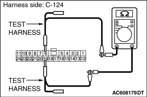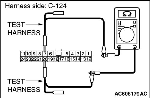 STEP 8. Check the wiring harness between joint connector (CAN3) C-124 and ECM connector B-109 [except RALLIART] for line-to-line short. Measure the resistance at joint connector (CAN3) C-124.