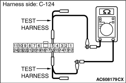 STEP 6. Check the wiring harness between joint connector (CAN3) C-124 and ABS-ECU connector A-03 [vehicles without ASC] or ASC-ECU connector A-51 [vehicles with ASC] for line-to-line short. Measure the resistance at joint connector (CAN3) C-124.