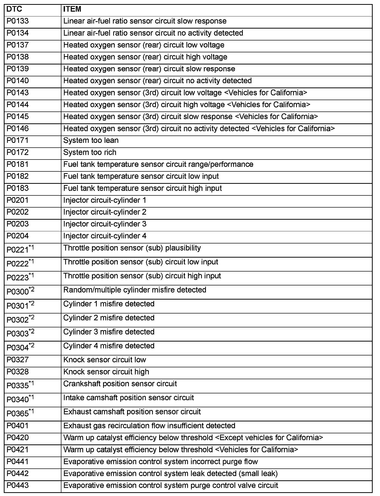 - The codes marked with a "*2" in the diagnosis code number column have the following two conditions for illuminating the Malfunction Indicator Lamp (SERVICE ENGINE SOON or Check Engine Lamp).