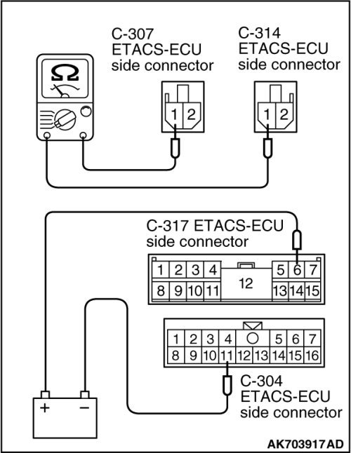 (3)Check for continuity between the C-307 ETACS-ECU terminal No. 1 and C-314 ETACS-ECU terminal No. 1 while connecting and disconnecting the jumper wire at the negative battery terminal.