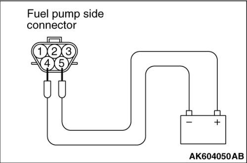 (2)Use jumper wires to connect fuel pump terminal No. 5 to the positive battery terminal and terminal No. 4 to the negative battery terminal.