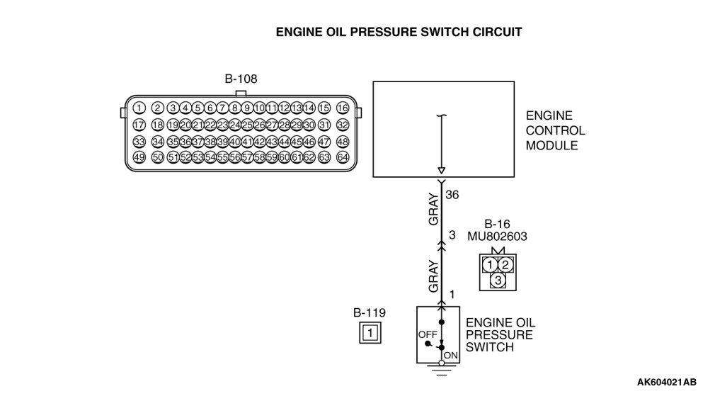 - Battery voltage is applied to the engine oil pressure switch (terminal No. 1) from the ECM (terminal No. 36).