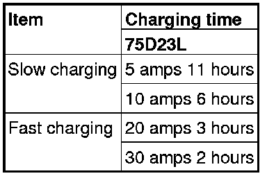 Recommended rate and time for fully discharged condition (flat discharged) is shown below. When the specific gravity of electrolyte keeps 1.22 to 1.29 for more than one hour, charging should be stopped.