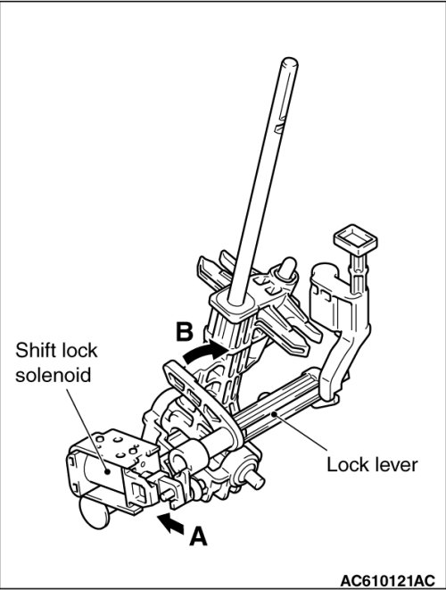 Check that the lock lever smoothly moves in the direction of arrow B in the figure when the shift lock solenoid plunger is pressed in the direction of arrow A, and smoothly moves back to the original position when the plunger is released.
