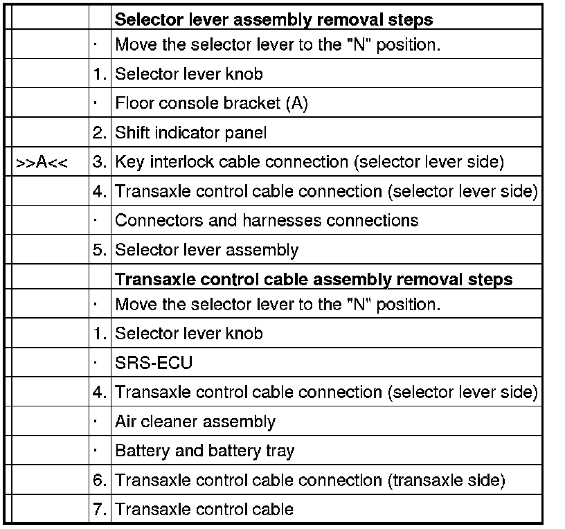 Be careful not to subject the SRS-ECU to any shocks during removal and installation of the transaxle control cable assembly.