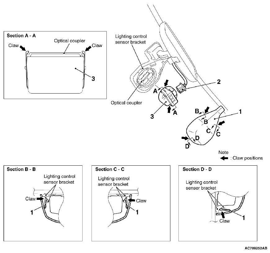 - When reusing the lighting control sensor or when the lighting control sensor is pushed to check the installation condition, install the connector and the lighting control sensor cover and wipe the windshield thoroughly. When the windshield is dry, execute the lighting control sensor (rain sensor) adaptation.[ Programming and Relearning] .