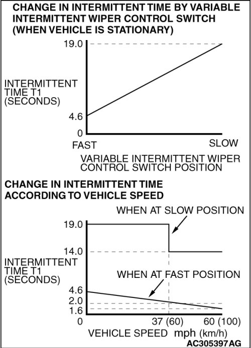 ETACS-ECU uses the dial position of the variable intermittent wiper control switch and the vehicle speed signal sent by the combination meter to calculate the interval to be sent to the front-ECU.