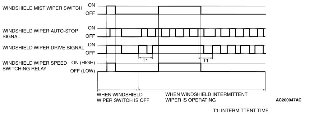At the point the windshield mist switch is turned ON, if the windshield wiper has been operating intermittently, the same operations as the above will be performed while the windshield mist wiper switch is ON. After the windshield mist wiper switch goes OFF, the intermittent operations will be set again T1 seconds after the last windshield wiper auto-stop signal turning ON.