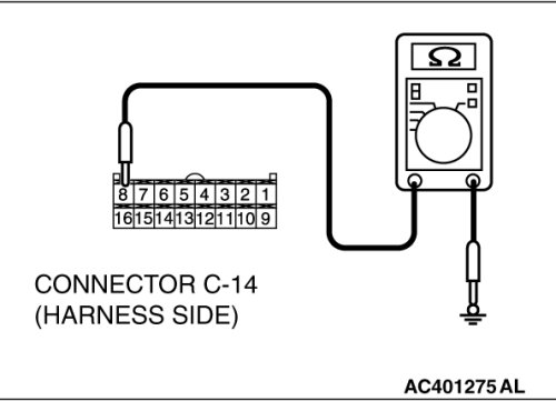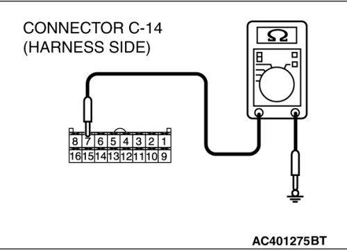 STEP 7. Check the wiring harness between A/C-ECU connector C-14 (terminal 2) and ground.