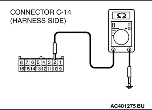 (2)Measure the resistance between A/C-ECU connector C-14 terminal 2 and ground.