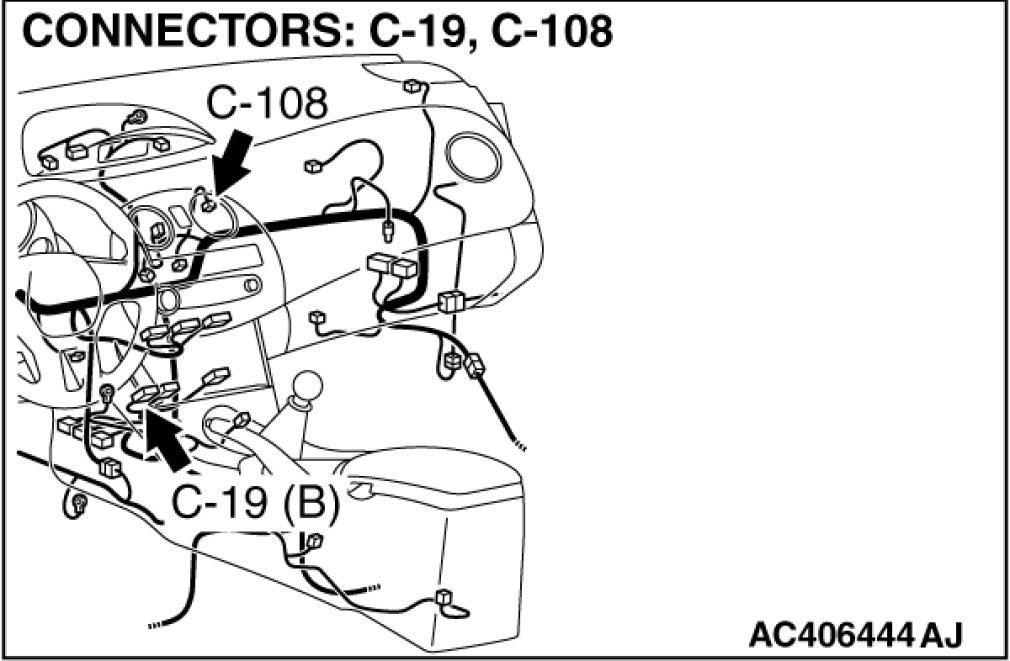 (1)Disconnect A/C-ECU connector C-19 and outside/inside air selection damper control motor connector C-108, and measure the resistance at the wiring harness side.