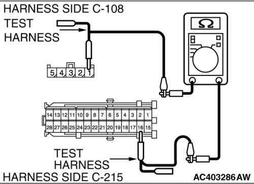 STEP 12. Check the wiring harness between junction block connector C-215 (terminal 16) and outside/inside air selection damper control motor connector C-108 (terminal 1).