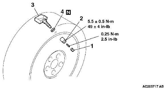 After tire inflation, retighten the valve nut 5.5 ± 0.5 Nm (49 ± 4 in-lb). This is necessary, because the TPMS transmitter is secured to the wheel with the valve nut and rubber grommet. The rubber grommet will be depressed by tire pressure or deteriorate over a period of time, which requires the valve nut to be retightened.