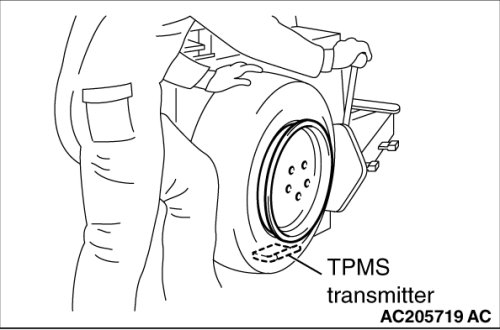 - If the TPMS transmitter is replaced, execute "Tire Pressure Sensor ID Registration" on scan tool MB991958 "Special Function."